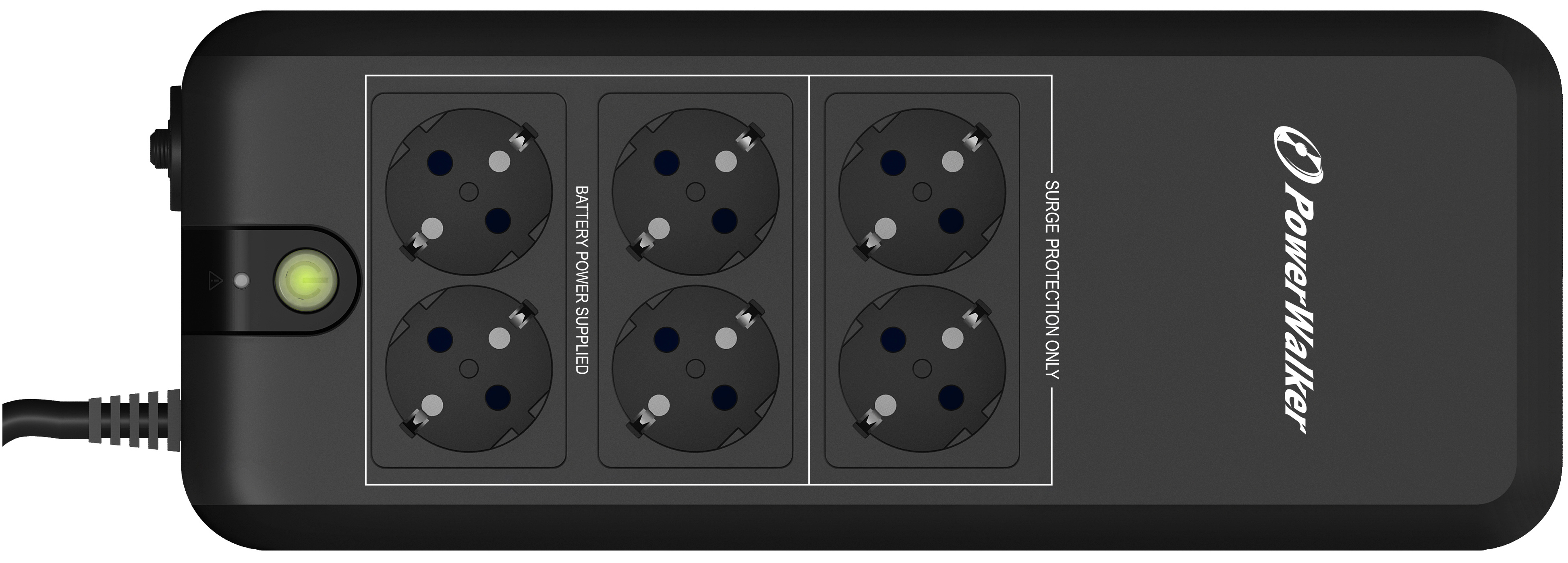 PowerWalker VFD APFC series is a standby/offline UPS for home and office applications, and it is equipped with a technology that supports the full use of the UPS’s power, even when used with a APFC device. Usually, it is required to oversize the UPS to ensure secure backup when connecting with a power load with “Active Power Factor Correction”, APFC. Therefore, you can choose a smaller cost-effective UPS. Besides the lower purchase price, it also saves energy cost due to lower own power consumption. Equipped with 6 outlets (all with surge protection, 4 with battery backup) these models can be used like a power strip. A special battery compartment enables an easy exchange of the rechargeable battery by the user.