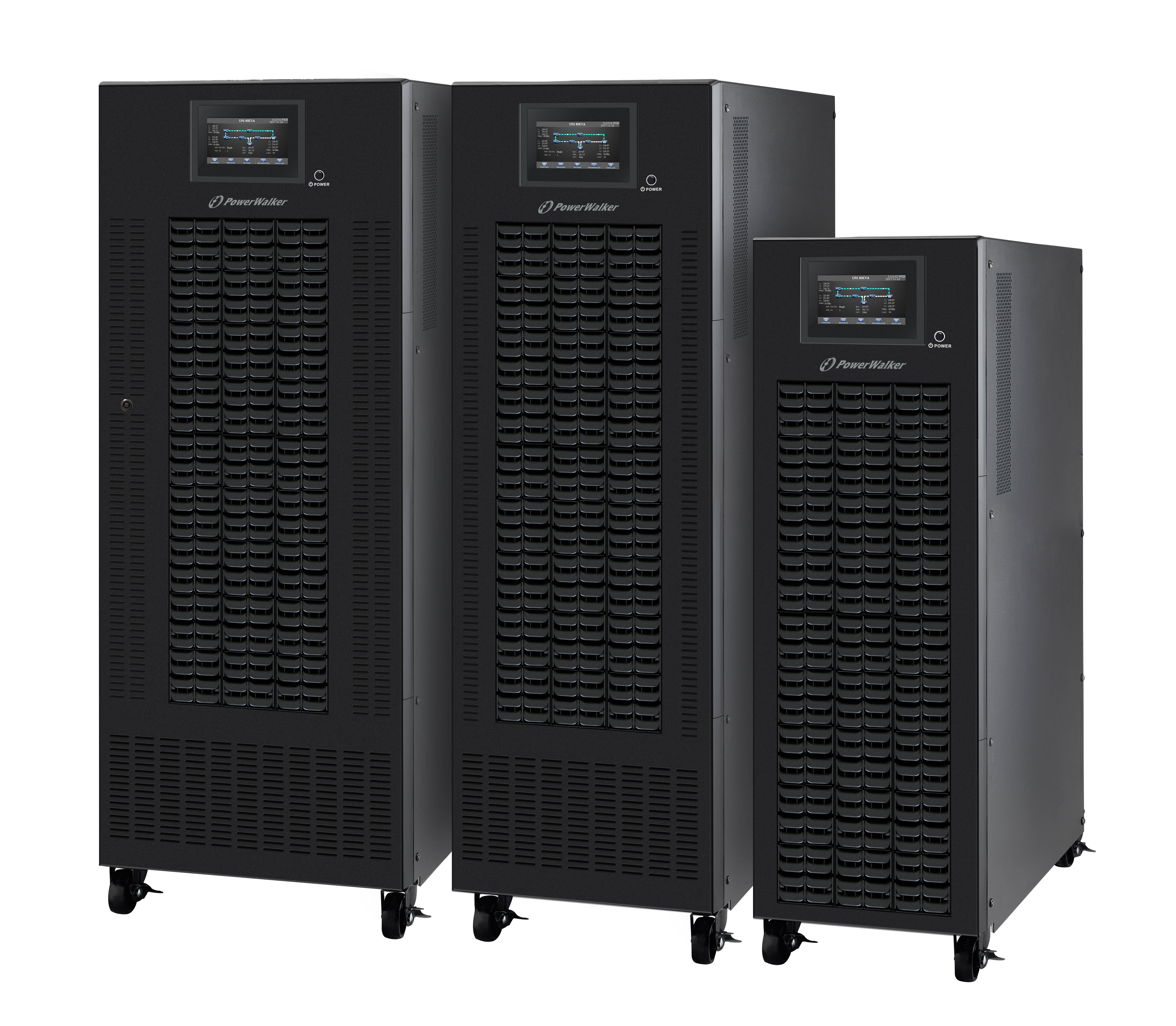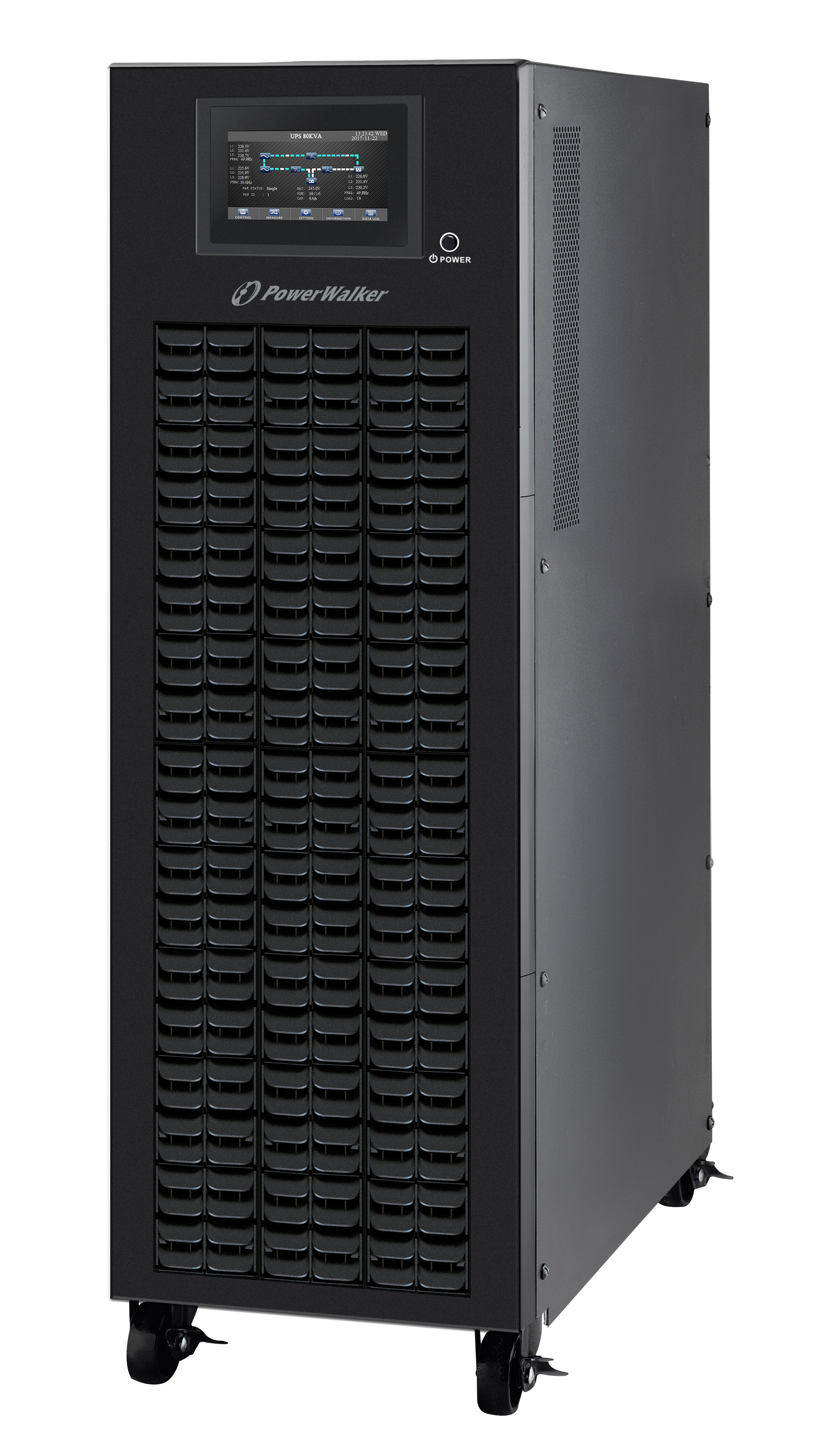 The PowerWalker VFI CPG 3/3 PF1 series is a professional commercial solution built in double conversion technology with power factor 1.0. Equipped with three-level inverter topology, it results in high efficiency reaching 95.5% in Line Mode and even 98.5% in ECO Mode. The series ensures low harmonic distortions and precise voltage regulation (1%). All phases have Active Power Factor Correction.